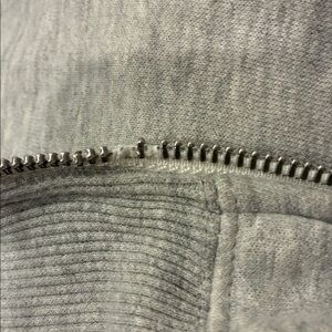 Stylish gray track jacket with 'New York' lettering. Features dark blue stripe details on sleeves, has three small imperfections. One near a stripe on the arm, one on the cuff, and one barely visible on the front. Sadly this sweatshirt does not zip, but otherwise is in great condition.