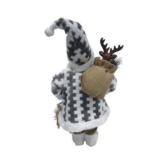 ring cozy mountain-lodge charm to your holiday décor with this 18-inch Nordic Santa Claus figurine, styled in warm rustic tones of gray, white, and brown. Santa wears a soft checkered coat with faux fur trim, a Fair Isle knit sweater, and carries a reindeer figure, frosted greenery, and a small wooden sled.