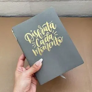 “Disfruta cada momento” Stylish gray notebook. Features gold lettering. Perfect for notes and journaling with included pen. NEW