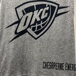 Stylish gray V-neck T-shirt featuring OKC logo. Perfect for casual wear.