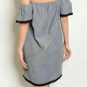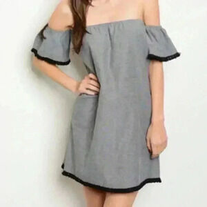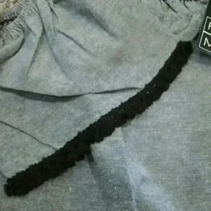 GRAY OFF SHOULDER DRESS WITH BLACK LACE TRIM. 100%polyester/light weight