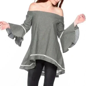 This Gray off shoulder tunic top Features 3/4 bell sleeves, elasticized off shoulder neckline & lace trim detail