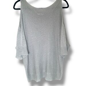 This gray off-the-shoulder sweater features a stylish cold shoulder design and a relaxed, oversized fit. The fine ribbed knit adds a subtle texture, making it a versatile piece for any wardrobe. Crafted from a soft, lightweight fabric, it offers both comfort and elegance.