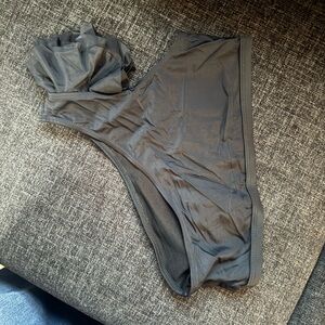 Stylish gray one-shoulder top with ruffle detail. Perfect for a chic look.
