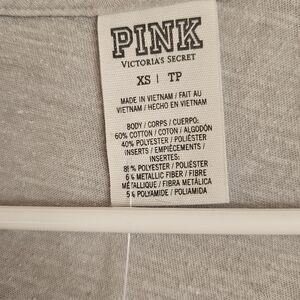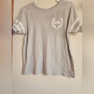 Casual gray T-shirt with PINK logo. Features short sleeves and a relaxed fit.
