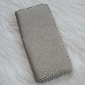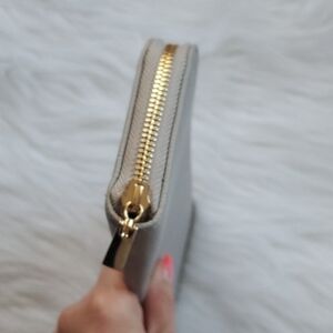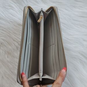 In Perfect Condition. 8 Card Slots, large zip pocket. Tons on room. Slender in side. 8x4 inches. Gold Hardware. Gray in color.