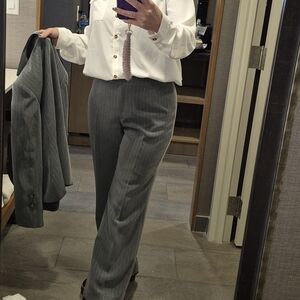 Elevate your style with this sophisticated gray pinstripe woman's suit. Perfect for any formal occasion, this suit offers a classic and timeless look.