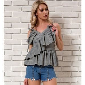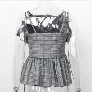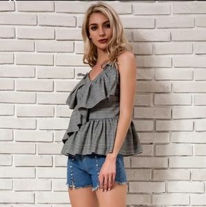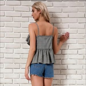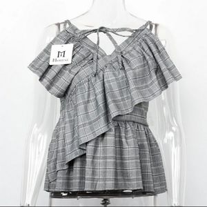 Gray plaid spaghetti strap blouse with front ruffles. New in Packaging