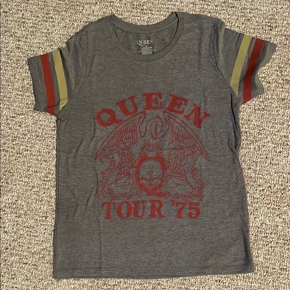Gray t-shirt featuring Queen Tour '75 design. Red graphic with striped sleeves. Never worn.