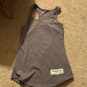 Stay comfortable and stylish with this gray racerback tank top. Perfect for workouts or casual wear.