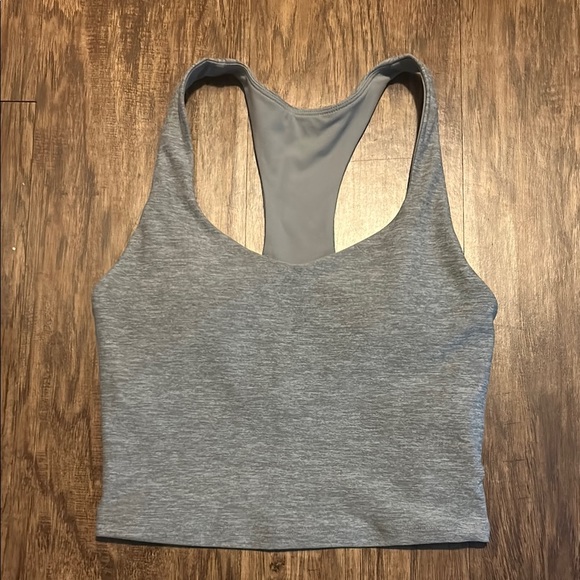 Stylish gray racerback tank top. Perfect for workouts or casual wear.