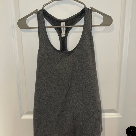 Stay comfortable and stylish with this gray racerback tank top. Perfect for workouts or casual wear.