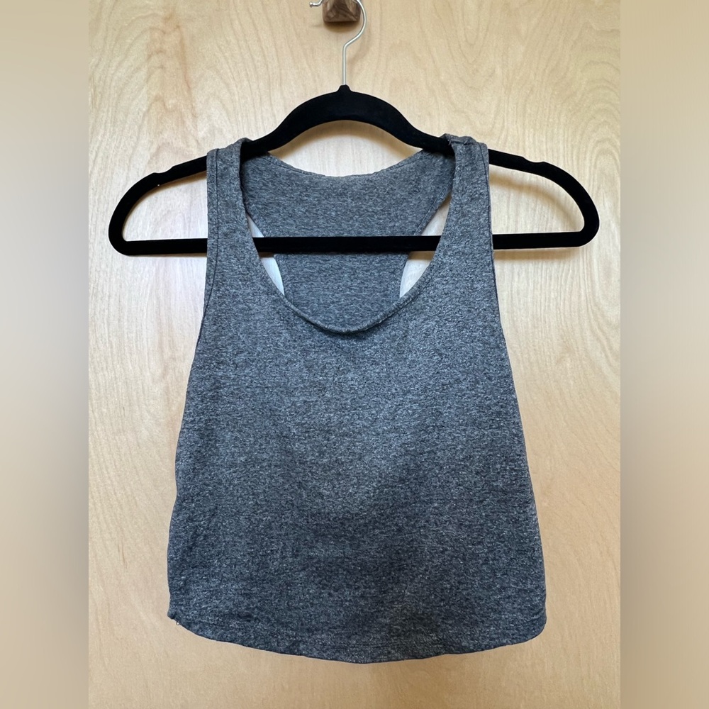 Stylish gray racerback tank top. Perfect for casual wear.
