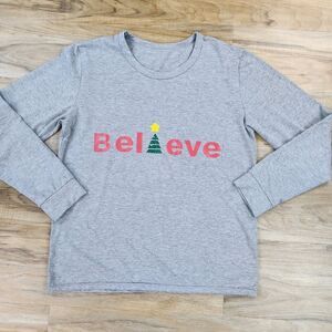 Comfortable gray shirt featuring a festive 'Believe' print. Striped pants with Cuffed ankles and elastic waistband. Soft and stretchy. Cotton and polyester blend