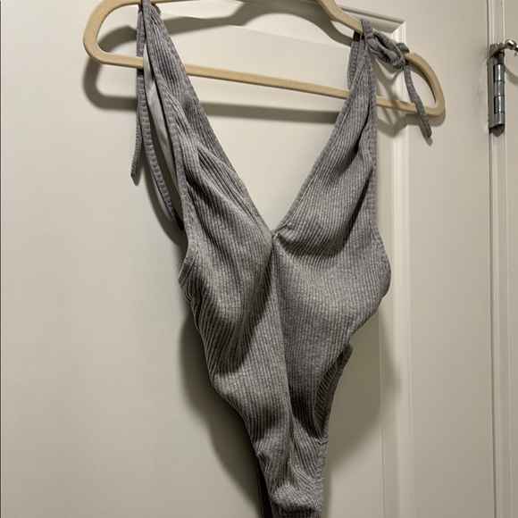 Stylish and comfortable gray ribbed bodysuit. Perfect for any occasion.