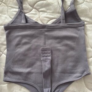 Stylish gray ribbed bodysuit with adjustable straps. Perfect for layering or wearing alone.