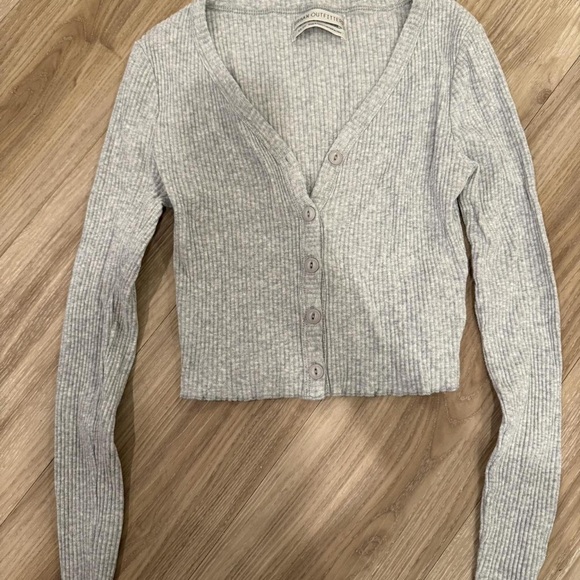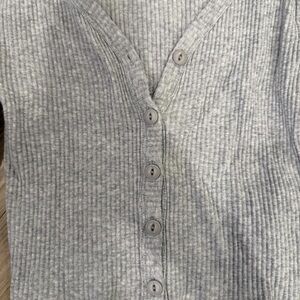 Stylish gray ribbed cardigan with button-up front. Perfect for layering.