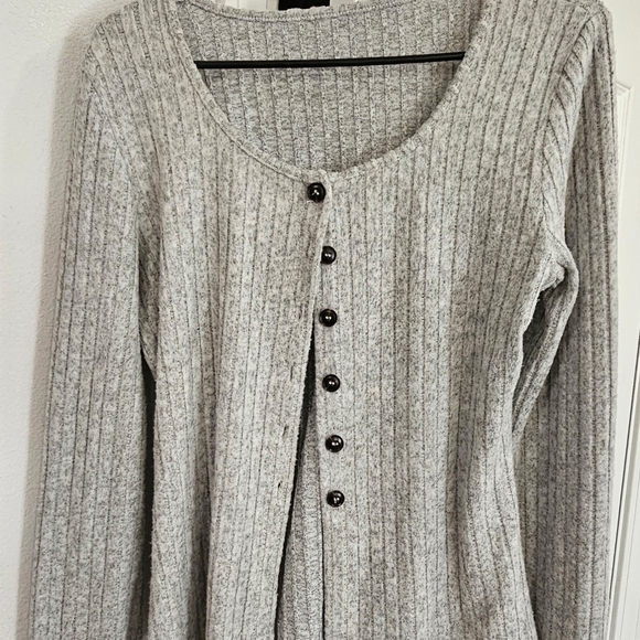 Stylish gray ribbed cardigan with button-up front. Perfect for layering.