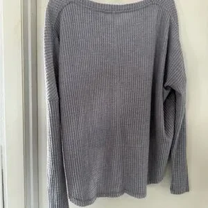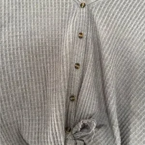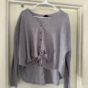 Cozy gray ribbed sweater with button-up front and tie detail. Perfect for layering.
