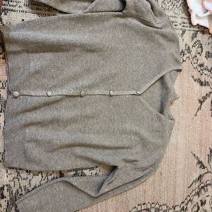 Stylish gray ribbed cardigan sweater with button closure. Perfect for layering.