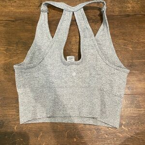 Stylish gray ribbed crop top with a V-neck design. Perfect for casual wear.
