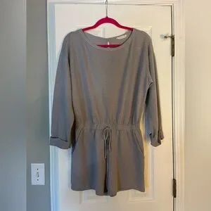 Casual ribbed jumpsuit with drawstring waist. Long sleeves with roll-tab cuffs. Soft, relaxed fit. Versatile everyday piece.