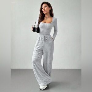 Elevate your style with this chic gray ribbed jumpsuit. Perfect for any occasion, it offers comfort and elegance.