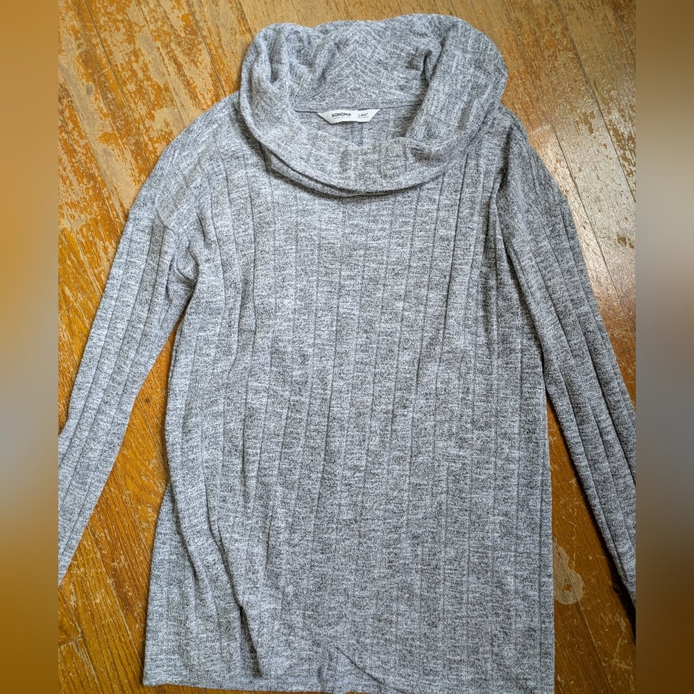 Cozy gray ribbed knit sweater. Perfect for pregnancy through nursing your infant.