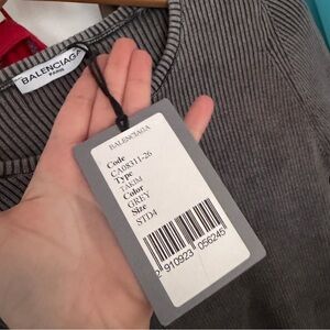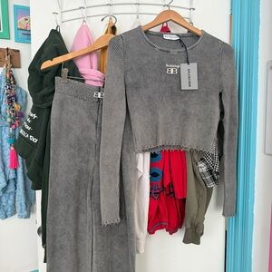 This Balenciaga grey ribbed long-sleeve crop top and matching trousers lounge set features intentionally distressed detailing on the hems. Super stretchy and comfy material. As seen on Kim K.