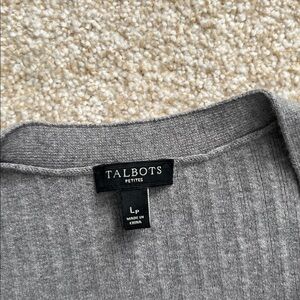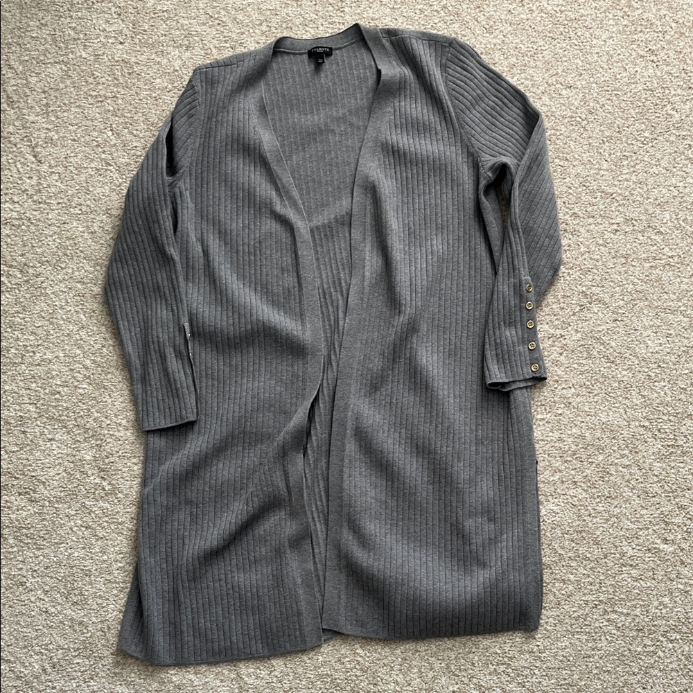 Stylish gray ribbed cardigan with button details on sleeves. Perfect for layering.