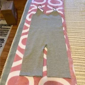 Stylish gray ribbed romper with spaghetti straps. Perfect for casual wear.