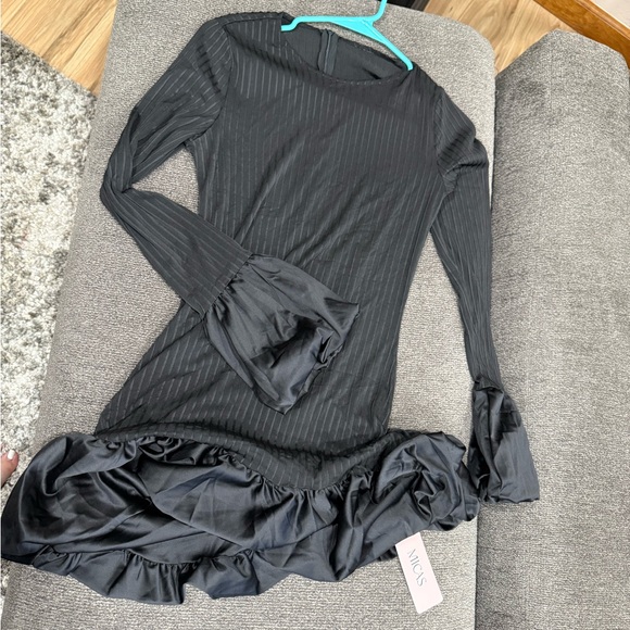 This gray bodycon dress is perfect for a night out, featuring a ribbed texture and ruched detailing that adds a touch of elegance. The long bell sleeves and crew neck create a sophisticated silhouette, while the tie front accentuates the waist for a flattering fit.