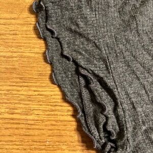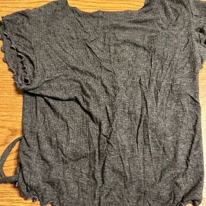 Gray ribbed crop top with adjustable front ruching and a flattering V-neck. Soft knit fabric with short ruffle sleeves for a feminine touch. Easy-to-style piece that pairs well with high-waist skirts or jeans. Green