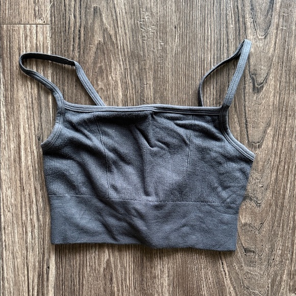 Stylish gray ribbed crop top with spaghetti straps. Perfect for casual wear.