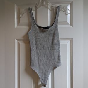 This gray, ribbed, square neck bodysuit is a high quality closet staple! It's made of thicker material that provides plenty of compression which feels great, although I wouldn't recommend it for anyone larger than a C cup because it was slightly too tight on me (32D)
