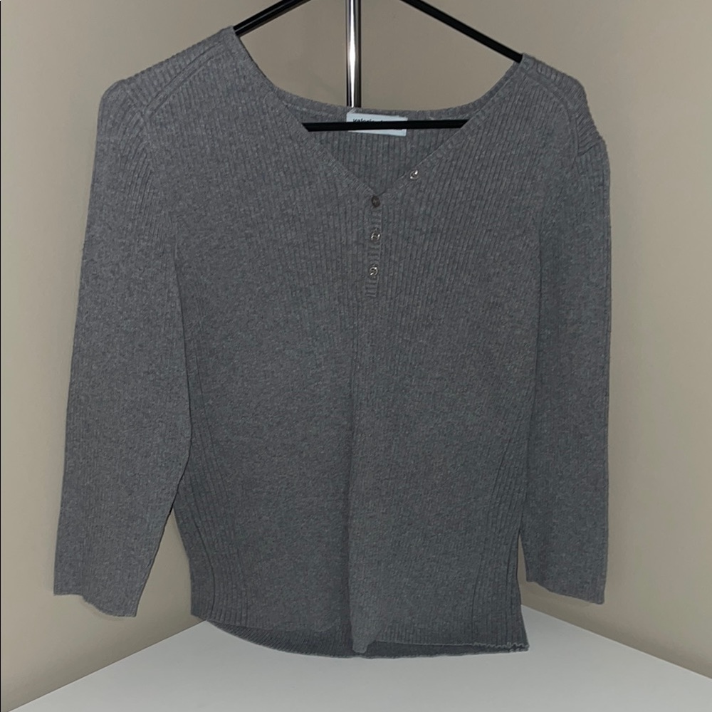 Stylish gray sweater with ribbed texture. Features a buttoned neckline. Perfect for casual wear.
