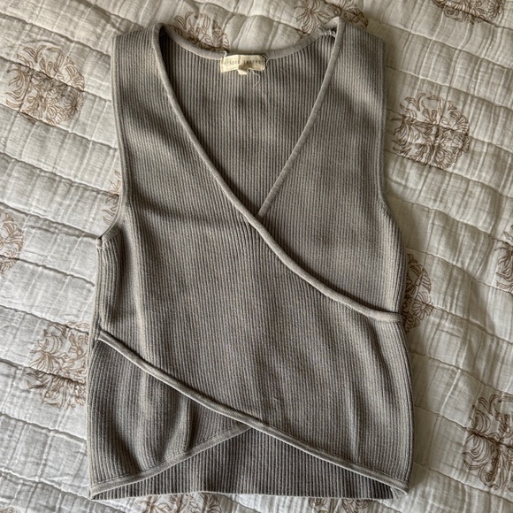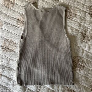 Stylish gray ribbed sweater tank. Perfect for layering or wearing alone.