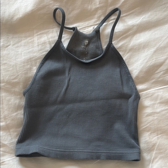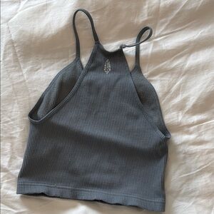 Stylish gray ribbed tank top with a halter neck design. Perfect for casual wear.