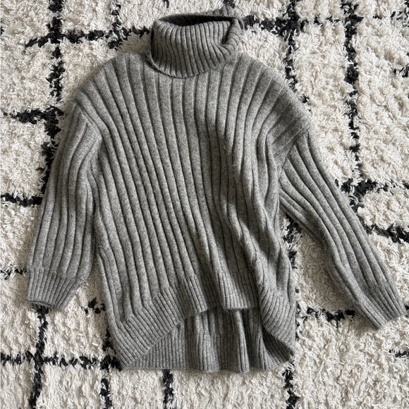 Stay cozy and stylish with this gray ribbed turtleneck sweater. Perfect for any occasion, it offers both comfort and elegance.