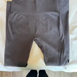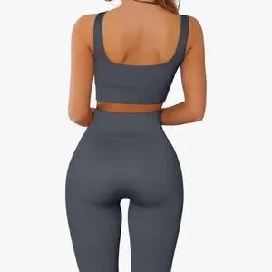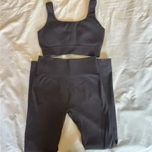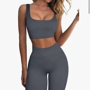 Stylish gray ribbed two-piece set. Includes a crop top and high-waisted leggings. Perfect for casual outings or workouts.