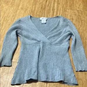 Stylish gray ribbed sweater with a flattering V-neck design. Perfect for casual wear.