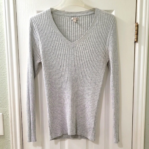 Stylish gray ribbed V-neck sweater. Perfect for layering. EUC armpit to armpit: 18" length: 26"
