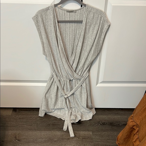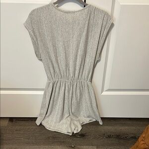 Stylish gray ribbed wrap romper with tie waist. Perfect for casual outings.