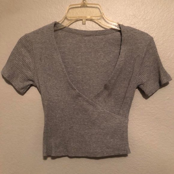 Elevate your wardrobe with this stylish gray ribbed wrap top. Perfect for any occasion, this top offers both comfort and elegance.