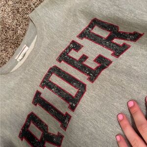 Cozy gray sweatshirt with 'RIDER' text in bold letters. Perfect for casual wear.