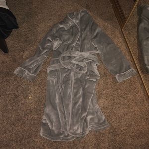 Bed Bath and Beyond plush gray bath robe. Very long (down to my feet almost and I’m 5’0). Very comfy, soft and warm. Has pockets. Ive never worn but it came in a clear zipper bag which I threw away.