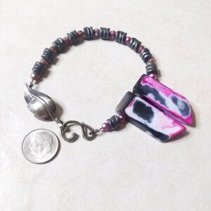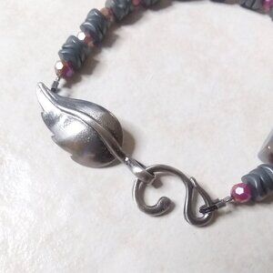Gray & Rose Pink Agate + Hematite Bracelet! Two-Sided w. Gunmetal Leaf Toggle