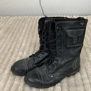 NWOT Roxy dark gray combat boots with a rugged, utilitarian look. Lace-up front with a structured shaft, reinforced toe, and durable textured upper. Side pocket detail adds a functional, military-inspired edge. Low stacked heel with a sturdy sole for everyday wear. Versatile neutral gray that works with jeans, cargos, or dresses.