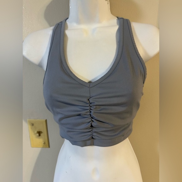 Stylish gray crop top with ruched front. Sleeveless design. Perfect for casual wear.
