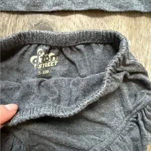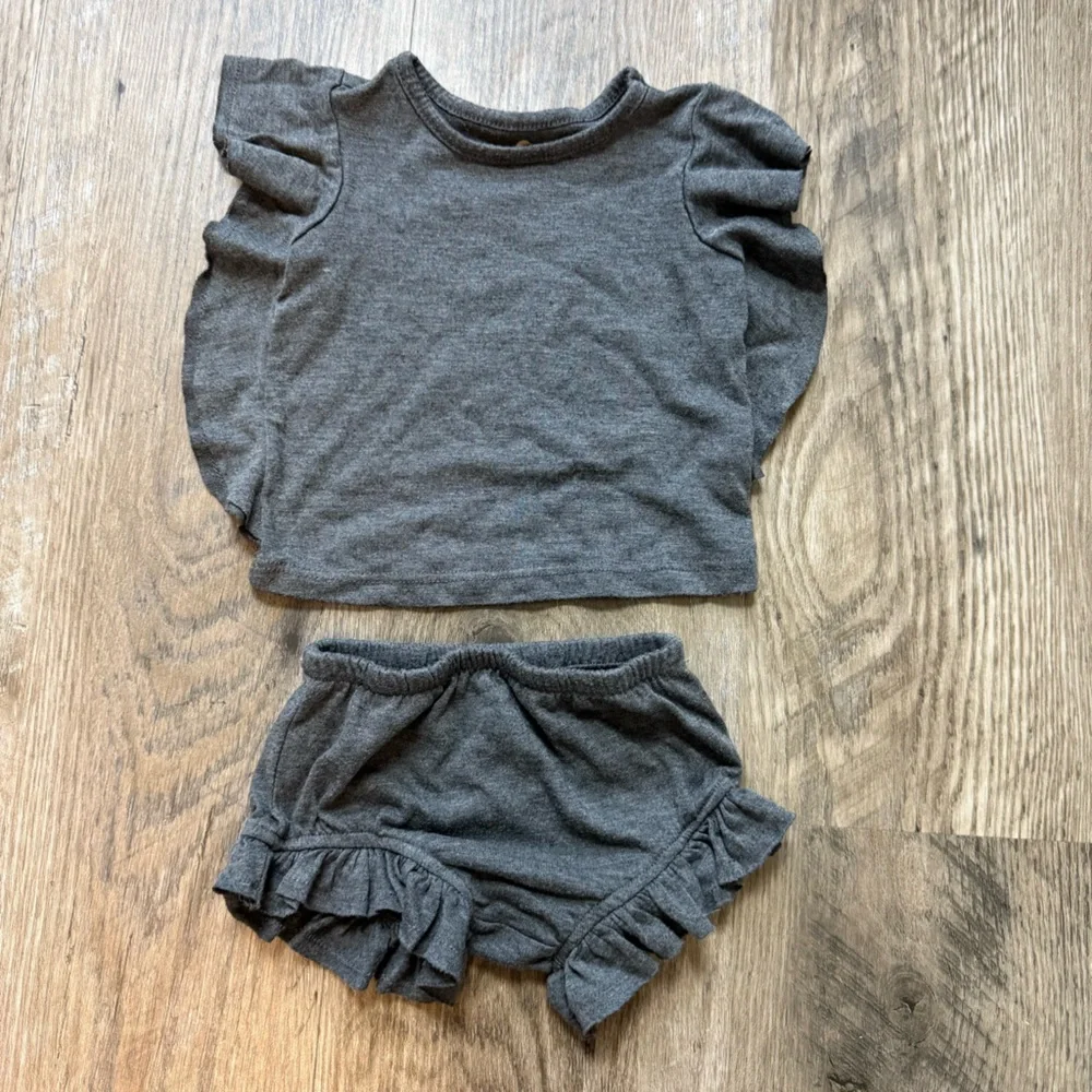This charming gray set features a ruffled top and matching diaper cover, crafted from soft, comfortable fabric. The delicate ruffle details add a touch of elegance to this cozy ensemble, making it perfect for everyday wear.